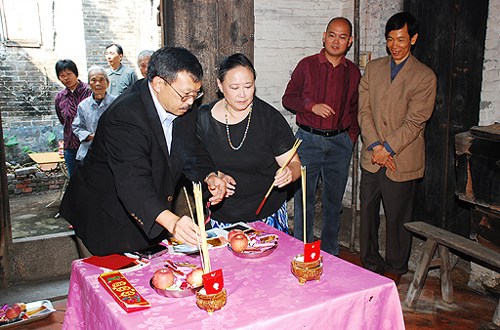 在省、区侨务部门工作人员的陪同下,赵中求先生一行首先来到古井霞路的五福里。走进自己爷爷的祖屋,赵中求及其姐姐就迫不及待地和乡亲们照相。他们一边观看挂在墙壁上的老照片,一边向乡亲讲述关于其爷爷、父亲的经历。接着,他们还在祖屋大厅上香,认祖归宗。