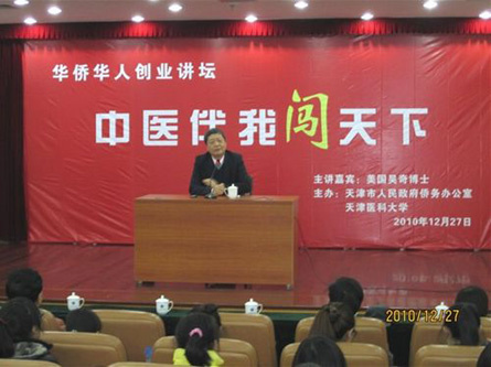 中新网12月29日电 据天津侨网消息,旨在发挥侨务优势,促进天津市大学生开拓就业思路创新创业的“华侨华人创业讲坛”27日在天津医科大学隆重启幕。首讲邀请了美国世界传统医学联盟主席吴奇博士作《中医伴我闯天下》演讲,受到天津医科大学、天津中医药大学近300名学生的热烈欢迎。市侨办副主任陈永义以及医科大学、中医药大学统战、学生部门负责人出席讲坛。