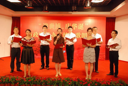 中新网9月4日电 为了迎接中国2010年上海世博会的召开,庆祝中华人民共和国建国六十周年,上海市政府侨办系统于9月1日假静安区文化馆举行“迎世博、庆华诞”诗歌朗诵比赛,市委统战部副部长丁志坚,市政府侨办副主任陈文佳、倪俊南、刘建平出席活动。比赛还邀请到宋怀强、刘子枫、赵静、程乃珊等侨界知名艺术家担任评委。
