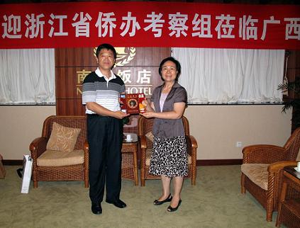 中新网9月11日电 9月10日,浙江省侨办副巡视员戴小迅率领浙江省侨办赴广西学习考察组一行13人抵达广西南宁,与广西侨办交流学习。广西自治区侨办副主任钟志英、副巡视员陈宁亲切接待了考察组一行。