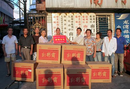 在欢度国庆60周年和喜迎中秋节日之际,浙江省温州市鹿城区侨联倡议全区侨联开展“侨心助残”活动。温州鹿城区南门街道侨联在主席王朝贵带领下,组织二十多位侨联骨干,共捐资4400元,购置8台21寸彩电赠送给本辖区八位残疾人(王平阳、陈飞虎、戴益胜、蒋 萍、金开明、易建珍、陈长聪、王皓光)。(温州市侨联 薛新山 张维光)
