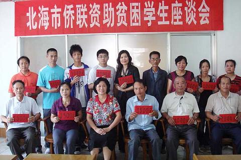 中新网11月2日电 10月24日上午,广西自治区北海市侨联召开今年的第三次资助贫困学生座谈会,为官泽婵、张远宁、廖丹丹3名贫困大学生和许程程等10名贫困中学生,分别资助每人每学年1500元和1000元,当天共计发放由广西侨联华侨爱心基金会海内外华人华侨、企业家和爱心人士捐助的助学金14500元。