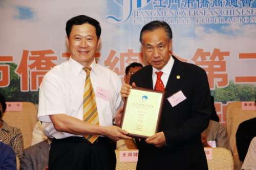 王南健等向新当选的理事会成员颁发了证书。广东省侨办副主任陈仰豪对侨商总会成立三年来所取得的成绩和自身发展给予充分肯定。江门市委副书记谭继祖代表市委、市政府对侨商总会和广大侨商为江门市经济社会发展所做出的贡献表示衷心感谢;并指出,市侨商总会自成立以来,秉承“为会员服务、为经济建设服务、为社会服务”的宗旨,在加强内外沟通、以商引商、应对国际金融危机、为侨资企业排忧解难、支持侨乡慈善公益事业等方面,做出了大量卓有成效的工作,衷心希望侨商总会与各位侨商朋友继续大力宣传推介江门的投资环境,吸引更多的侨商到江门投资兴业和经贸洽谈。