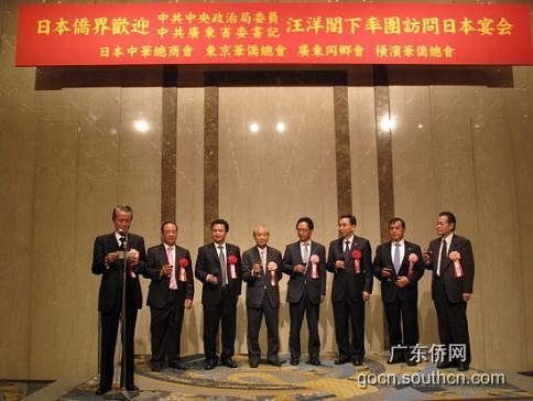 中新网11月6日电 据广东侨网消息,11月4日晚上,为欢迎中共中央政治局委员、广东省委书记汪洋率团访问日本,日本中华总商会、东京华侨总会、日本广东同乡会、横滨华侨总会在东京最著名的赤坂格兰王子大酒店五色大厅联合举行欢迎宴会。这也是日本新、老侨团历史上首次联合举办活动欢迎国内的代表团。