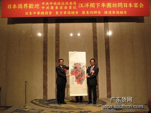 日本中华总商会会长严浩代表宴会主办单位向广东省代表团赠送了纪念品,广东省委常委、广州市委书记朱小丹向宴会主办单位回赠了国画《红荔》。广东省外办、省外经贸厅等省直有关单位及有关市领导也出席了当晚的欢迎晚宴。(陈雪婷)