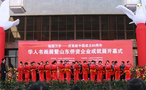 中新网11月10日电 据山东省侨办消息,“祖国万岁——庆祝新中国成立60周年华人书画展暨山东侨资企业成就展”大型宣传展览活动11月6日在济南拉开帷幕。国务院侨办副主任马儒沛、省政协副主席李德强、著名书画家刘宝纯出席活动开幕式并为活动剪彩。省侨办主任王琳在开幕式上致辞,省侨办党组书记朱绪平主持开幕式。