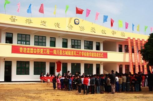 陆川县古城镇清耳二片村,有人口8000多人,既是革命老区,又是库区,人多田少,村民主要靠去广东打工谋生,生活水平较低。二片分校是一所完全小学,有学生350人,教师13人,原有教室是上世纪六十年代修建,部分桁条腐朽,漏风漏雨,现状堪忧。今年2月18日,广西自治区侨办副主任钟志英一行考察了该校,并积极向海外慈善基金会推介,成功获得香港道德会无偿捐赠32万元。教学楼总投资82万元,香港道德会无偿捐赠32万元,地方政府配套50万元,于6月4日动工建设,11月初完工。同时配套建设篮球场、水井、卫生间、校门,使学校旧貌换新颜,成为陆川县功能齐全、设施一流的小学。