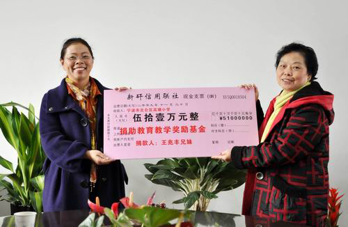 中新网12月3日电 据浙江侨联网消息,11月30日上午,已故浙江省北仑籍港胞王兆丰先生的大儿媳唐秀娟女士代表王氏家族把祖屋拆迁的赔偿款51万元亲手交给了新碶街道高塘小学校长唐亚云的手中,用于设立“王兆丰兄妹教育教学奖励基金”。至此,这件长达10余年的捐赠事宜终于画上了圆满的句号。宁波市北仑区教育局局长胡小伟、新碶街道办事处主任徐孟杰、区侨办副主任姚慧贞、新碶街道党工委委员林雪凤出席基金成立仪式。新碶街道办事处副主任李国东主持仪式