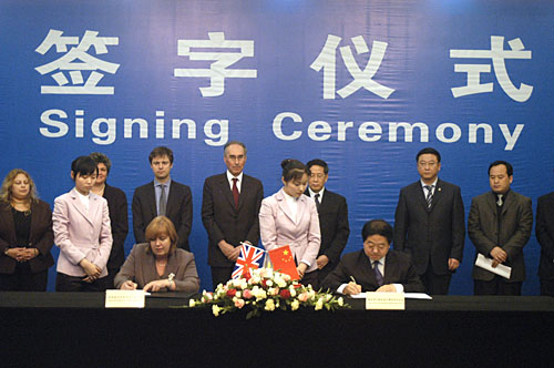 副市长周慕冰、英国驻华大使欧·威廉爵士、市政府外侨办主任郝明出席签字仪式。市政府外侨办副主任王雯主持签字仪式。