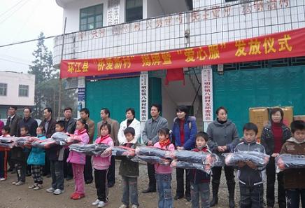 出席揭牌仪式的领导还向明伦镇八面、八合小学及环江县特教学校400多名师生发放了胡家仪先生及其公司捐赠的御寒羽绒服。(莫棉荷)