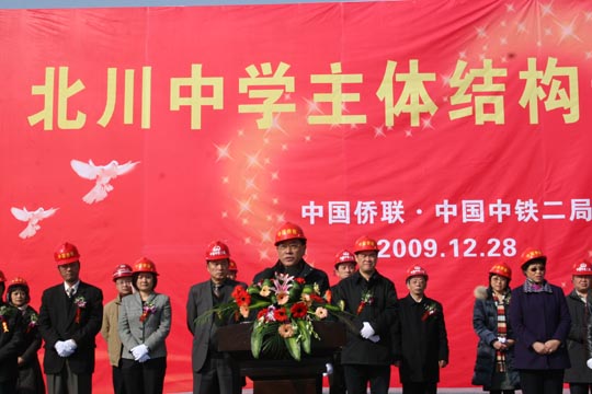 他表示,中国侨联作为北川中学援建中的倡导者和组织者,将以对历史负责、对人民负责、对北川中学负责的精神,力争把北川中学建设成为让全国人民放心,让广大师生和家长安心的学校。