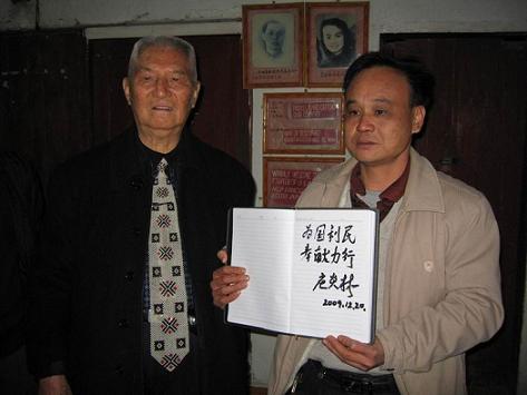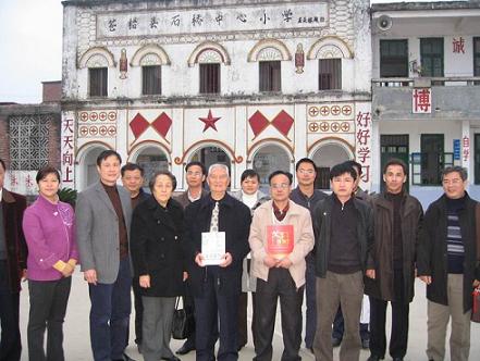 当天下午,年近九旬的庄炎林,不顾旅途的疲劳,在梧州市侨联主席钟小欣、苍梧县统战部部长李燕芬等领导的陪同下,来到苍梧县石桥镇中心小学考察。其中心小学是庄炎林先生在抗日战争期间,以教师身份掩护开展地下工作的地方。今日重游故地,庄炎林先生格外激动,并向陪同人员讲起了当年的工作情景。随后庄炎林先生一边听取该学校的情况,一边参观当年曾用过的工作室,并在留言簿上题词:为国利民,奉献力行。(蔡光天)