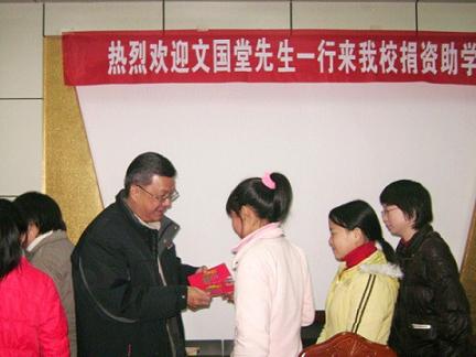 文国堂从2007年起,发起在香港的数名文氏后裔,在内地长期捐助62名贫困女高中生,给予每人每年1000元资助,并承诺捐助至大学毕业。这是他第三次来到吉安县,与受助女生见面并发放捐助金。文国堂与来自吉安县立中学和吉安县二中的20名女生亲切交谈,听取了学生们的心声,鼓励她们奋发进取。女生们现场合唱了《感恩的心》,已表达感激之情。