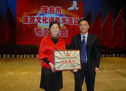 中新网1月20日电 据茂名外侨局消息,1月18日,由广东省茂名市纪委、市直工委主办的茂名市廉政文化进机关活动专题晚会在茂名影剧院隆重举行,广东省纪委领导及茂名市领导出席了晚会。晚会表彰了“十佳廉政文化理念”以及“廉政文化建设示范单位”,茂名市外事侨务局被评为茂名市“廉政文化建设示范单位”。