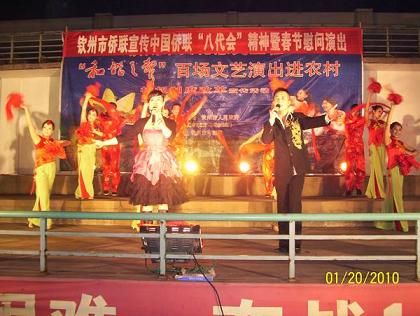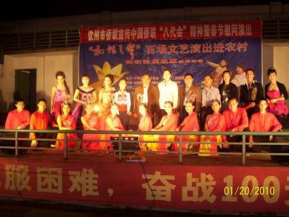 钦州市粤剧团共演出舞蹈、小品、独唱等20多个节目,内容丰富多彩,讴歌了钦州改革开放成就,有鲜明地方特色。观看群众达到3000多人。