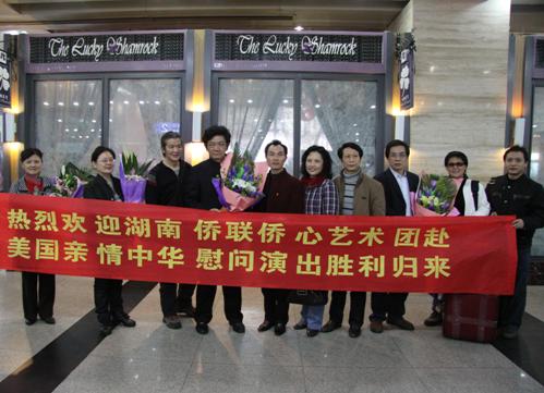 中新网2月11日电 据湖南省侨联消息,经湖南省政府批准,由湖南省侨联组团,湖南省侨联、长沙市外事侨务办公室、长沙市侨联、开福区侨联主办,应美国有关侨(社)团的邀请,湖南省侨联侨心艺术团于2010年1月23至2月8日,在纽约、洛杉矶、华盛顿、休斯敦、圣安东尼奥等城市“亲情中华”赴美慰问巡演,圆满成功,于2月9日载誉平安归来。