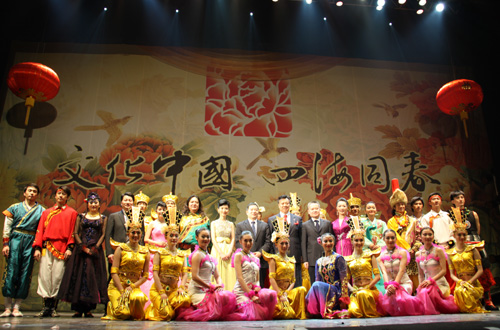 热烈喜庆的《新春花鼓》拉开了 “文化中国·四海同春”欧洲巡演的序幕。美丽婀娜的维族舞蹈《顶碗舞》、热情奔放的藏族舞蹈《快乐藏人》、气势雄浑的马头琴独奏《万马奔腾》赢得阵阵掌声;歌唱家吕薇的一曲充满乡音的《采茶舞曲》,让浙江籍侨胞倍感亲切;著名男高音歌唱家刘斌铿锵有力的《咱当兵的人》,将整台演出推向高潮;美轮美奂的舞蹈《千手观音》落下了艺术团在法演出的帷幕。持续近三个小时精彩绝伦的演出不时地博得了观众雷鸣般的掌声。侨胞们在《难忘今宵》的音乐声中久久伫立,不愿离去,赞叹“这是一场内容丰富、充满激情、民族特色浓郁、艺术水准高超的演出,令人难忘”。他们由衷地感谢国务院侨办在新春之际为旅法侨胞带来的文化盛宴。