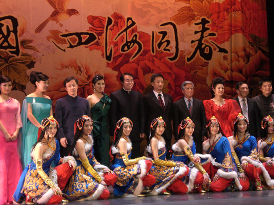 2月19日晚,“文化中国·四海同春”北美艺术团在洛杉矶的首场慰侨演出获得巨大成功。图为演出结束后,国务院侨办副主任、“文化中国·四海同春”北美艺术团团长许又声和中国驻洛杉矶总领事张云上台与演员们合影。