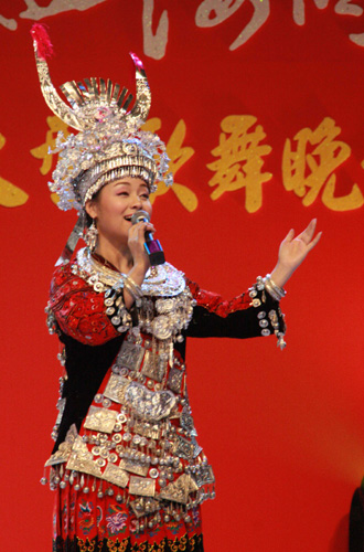 图为:“苗族歌后”阿幼朵身着民族盛装进行演唱。