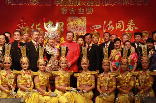 图为:中国驻菲律宾使馆大使刘建超、“文化中国•四海同春”亚洲艺术团团长、国务院侨办党组成员、秘书行政司司长熊昌良等全体嘉宾与演员合影留念