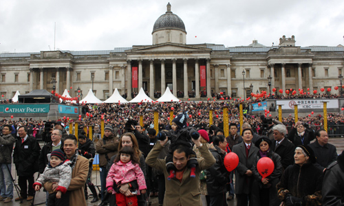 中新网2月22日电 2月21日中午,近三十万英国华侨华人及当地民众汇集在伦敦特拉法加广场,共同观赏了由中国国务院侨办副主任任启亮率领的“文化中国•四海同春”艺术团的精彩演出。中央民族歌舞团极具民族特色的歌舞和著名歌唱家刘斌、吕薇、桐瑶的倾情表演深深地打动了数以十万计的观众,使广大旅英侨胞在春寒料峭中感受到了来自祖(籍)国的温暖,也使在场的外国朋友领略到中华文化的魅力。