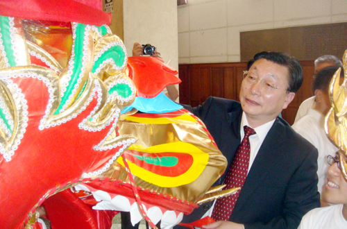 中新网2月24日电 率领 “文化中国·四海同春”春节南美慰侨访问演出团的中国国务院侨办副主任马儒沛,22日下午,在秘鲁中华通惠总局,为醒狮团点睛。