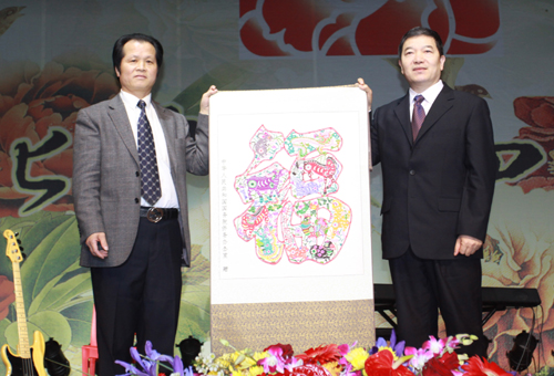 演出前,国务院侨办与威尼斯华侨华人联合总会互赠纪念品。图为国务院侨办副主任任启亮(右)向该会会长邱慧华赠送百福图。