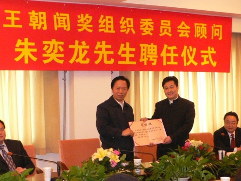 王文章代表中国艺术研究院向朱奕龙颁发了“王朝闻奖组委会顾问”的聘任书与感谢状。全国政协委员焦家良受其感染,表态愿效仿朱奕龙为文化事业所作的奉献,也向美术研究所捐献100万人民币,引起全体与会人员长时间的热烈掌声。