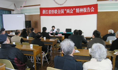 中新网3月22日电 据浙江省侨联消息,3月19日,浙江省侨联在华侨大楼“侨之家”举办全国“两会”精神报告会,邀请浙江省侨界出席“两会”的全国人大代表、浙江理工大学教授吴子婴和全国政协委员、浙江省侨联副主席、浙江华日集团董事长陈励君作全国“两会”精神报告。