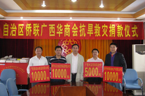4月2日上午,广西壮族自治区侨联举行了广西侨联、广西华商会抗旱救灾捐款仪式。广西壮族自治区侨联机关、广西华商会、广西华侨爱心基金会的全体干部群众,广西华商会会员企业——广西易能水煤浆有限公司、南宁澳华房地产有限公司、南宁长江企业投资集团有限公司、广西和正慈善基金会共捐款4.5万元。