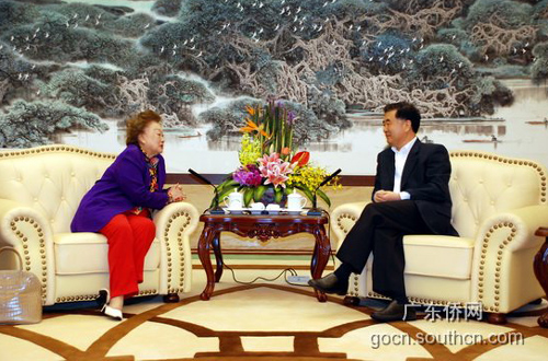 4月18日上午,中共中央政治局委员、广东省委书记汪洋会见了陈香梅一行。广东省政府副省长、新任广州市市长万庆良、广东省侨办主任吴锐成等参加了会见。