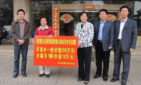此次的特大旱灾,给广西人民群众的生产生活造成了极大的影响。为帮助灾区群众解决饮水困难,国务院侨办、广西侨办启动了“侨爱工程”,积极投入抗旱救灾工作,并将旱情向海外侨胞通报。海外侨胞情系桑梓,心念着灾区,纷纷伸出援助之手,慷慨解囊,捐款捐物。此次华夏董氏兄弟商贸集团有限公司执行董事、旅澳侨胞董佩永先生通过国务院侨办“侨爱工程”向西南五省捐赠价值共2000万元人民币的矿泉水及部分水罐车,其中用于广西灾区的为价值500万元的物质,帮助灾民缓解饮水困难。(陈盛朝)
