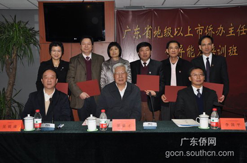 中新网4月23日电 据广东侨网消息,4月22日上午,广东省地级以上市侨办主任(局长)领导能力培训班举行结业典礼。原全国政协副主席、北京大学政府管理学院院长罗豪才出席了结业典礼并与全体学员合影留念。