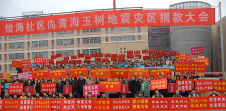 中新网4月23日电 据北京侨网消息,4月20日上午7时许,北京市丰台区侨资企业北京怡海怡海置业集团在怡海社区隆重举行抗震救灾捐赠大会。怡海社区居民、公司员工、师生共计5000多人参加此次捐赠大会,共同为青海玉树地震灾区奉献爱心。中国侨联办公厅副主任、中国华侨经济文化基金会副理事长刘奇先生,怡海集团董事长王琳达女士等参加了本次捐赠大会。