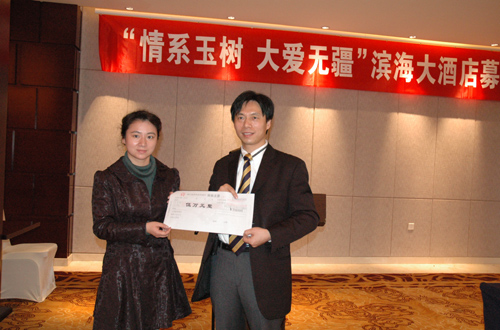 据了解,此次募捐仪式系温州市侨资企业、滨海大酒店员工自发组织,他们从不多的工资中纷纷拿出几十、几百,当场共募集一万八百多元。用员工代表的话说,那就是“能力不分高低,捐款不分多少,爱心不分迟早”,特别是其中一名聋哑员工也参与进来,其情其景令人感动。