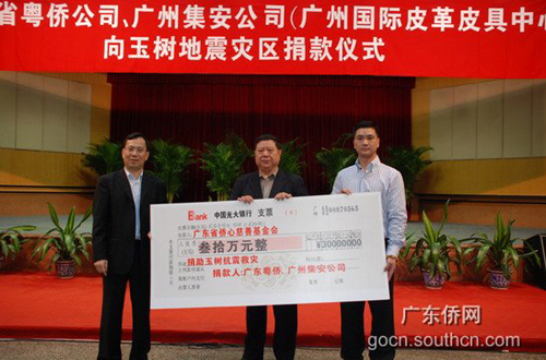 4月24日上午,简朴热烈的捐款仪式在广东省侨办二楼礼堂举行。广东省粤侨企业总公司党委书记、总经理詹奕群和广州温州商会会长、广州集安投资有限公司董事长朱清国,向广东省侨办副主任、省侨心慈善基金会荣誉主席朱尔武递交了30万元救灾捐款支票。广东省侨办副巡视员、省侨心慈善基金会监事长董华民主持捐赠仪式并讲话,他充分肯定了粤侨企业总公司、集安投资有限公司履行社会责任,积极参与赈灾济困,为国分忧、为民纾难的善举。据悉,这笔善款将经由广东省慈善总会尽快汇往玉树灾区。
