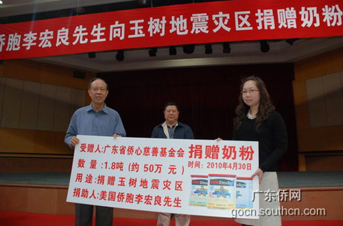 中新网5月4日电 据广东侨网消息,玉树灾情牵动广大海外侨胞、港澳同胞的心。在获悉青海玉树地区发生7.1级强烈地震的消息后,美国侨胞、南加州潮州会馆会长李宏良先生立即决定通过广东省侨心慈善基金会向玉树灾区捐赠1.8吨奶粉,价值约50万元人民币,以帮助玉树灾区的孩子渡过难关。