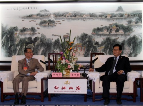 中新网5月13日电 据山东省侨办网站消息,5月11日晚,山东省人大副主任崔曰臣在舜耕山庄会见了华侨华人回家“观世博•游山东”考察团一行。