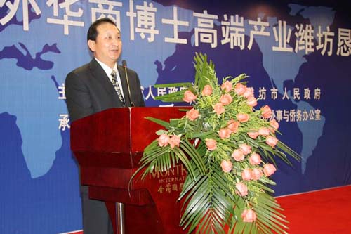 中新网5月27日电 据山东省侨办消息,由山东省侨办与潍坊市政府联合举办的“2010海外华商博士高端产业潍坊恳谈会”25日在潍坊高新区隆重开幕。来自美国、法国、加拿大、荷兰、厄瓜多尔、泰国、香港等7个国家和地区的近40位海外华商博士和潍坊市近50多位侨商和企业代表参加了开幕式。