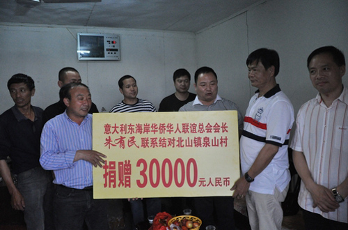 中新网5月28日电 据青田县侨联消息,5月26日,浙江省青田县委常委、县委办公室主任杨雷陪同青田籍华侨、意大利东海岸华侨华人联谊总会会长朱有民,来到联系其结对的北山镇肖山村和泉山村,分别向两村各捐赠3万元共计6万元,用于改善村庄的基础设施建设。