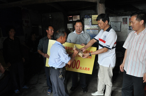 杨雷、朱有民一行人先后来到两村,跟村两委人员亲切交谈,了解村里的基本情况。肖山村全村800多人,有160多人留守在家,村民们主要收入来源就是稻田养鱼和油茶培育。而泉山村全村也就70多户村民,经济来源单一,生活生产困难。座谈会上,村干部们就如何发展该村经济效益而畅所欲言,同时也提出了由于地处偏远,经济发展不起来,资金不足而导致至今没有一幢像样的村委大楼等困难和问题。朱有民在了解情况后,毫不犹疑地向两村各捐赠了3万元人民币,用于村委大楼的建设,并表示以后村里如果有问题和困难,他都会一直关注和支持的。
