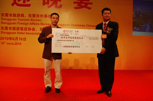 6月16日晚,“2010华人华侨畅游东莞系列活动”欢迎晚宴上,法属圭亚那皆因东莞同乡会向中国清海玉树地震灾区捐款61320元人民币,并委托东莞慈善会将善款转交灾区。(漆忠卫)