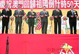 澳门各界三十一日在澳门友谊广场举行庆祝澳门回归倒计时五十天活动,全国政协副主席、澳门各界庆祝回归活动委员会主席团主席马万祺(左三)、澳门特别行政区首任行政长官何厚铧(左二)、新华社澳门分社社长王启人(左四)等嘉宾为庆祝活动剪彩。