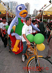 在澳门回归倒计时五十天庆祝活动中,具有澳门当地特色的三轮车载著吉祥物卡通"回归燕" 首次与公众见面。