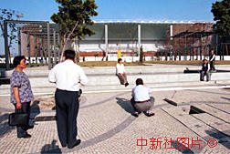 随著澳门回归日的临近,用於举行澳门政权移交大典的场馆成为澳门的新景点,许多来澳门的游客纷纷在即将落成的交接大典场馆外留影。 中新社传真 毛建军 摄