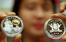 99北京国际钱币博览会十一日开幕,来自二十多个国家和地区的近七十家厂商展示了各自的钱币精品。图为"加拿大皇家造币厂"为澳门回归中国而发行的精铸纪念银币(正反面),出售价为680元,发行38888套。