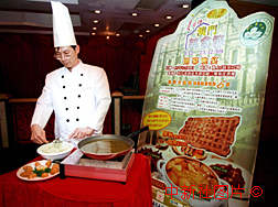 为庆祝澳门回归祖国,香港新光酒楼将於十二月一日举办盛大的"庆回归澳门美食节",以澳葡菜为主筵开六十多席,图为澳门木偶餐厅的大厨推介富有特色的"薯丝马介休"美食。
