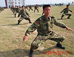 为了更好地做好澳门特别行政区防务工作,以及必要时协助特区政府维护社会治安和救灾,解放军驻澳部队官兵在常规军事训练中增加散打、南拳等训练科目,图为拳术演练。作者:王丽南