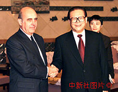 国家主席江泽民二十三日在北京人民大会堂会见澳门总督韦奇立。作者:李刚