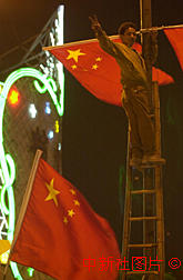澳门市政工人深夜在葡京酒店赌场外高挂五星红旗。
